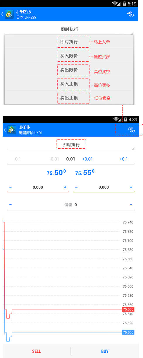 订单类型包括即时执行、买入限价、卖出限价、买入止损、卖出止损。