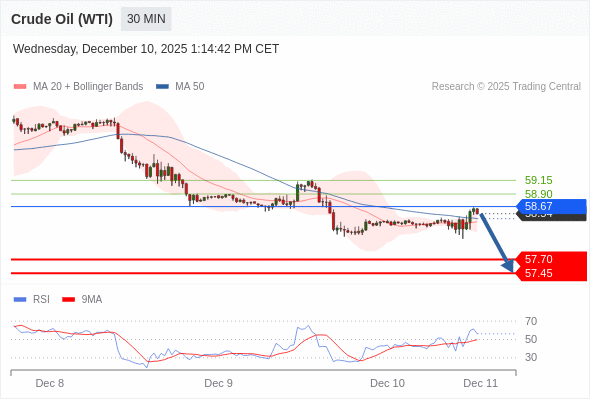 在 58.67 之下,看跌,目标价位为 57.70 ,然后为 57.45 。